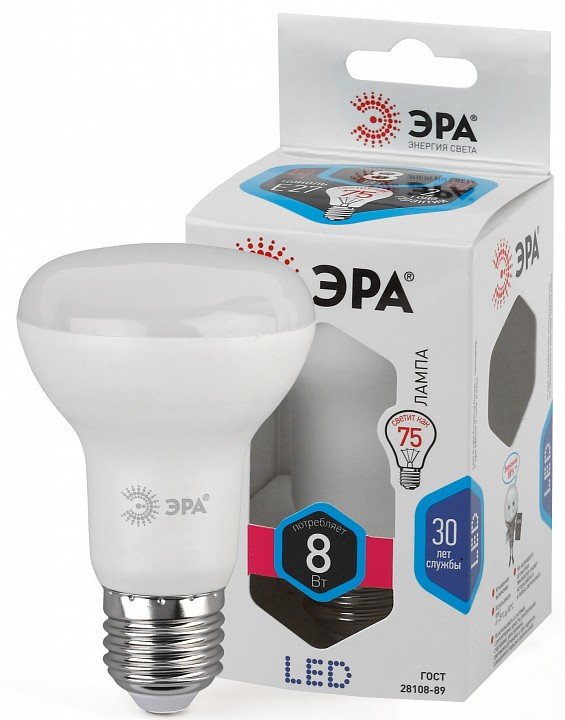 Главная Лампочки Лампа светодиодная ЭРА E27 8W 4000K матовая LED R63-8W-840-E27