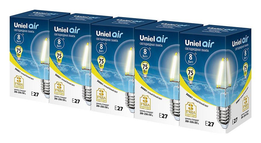 Станьте первым, кто оставит отзыв о товаре Лампа светодиодная Uniel (UL-00002210) E27 8W 3000K прозрачная LED-A60-8W/WW/E27/CL GLA01TR.