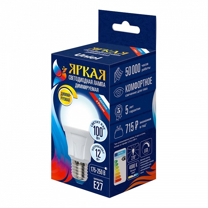 Главная Лампочки Лампа светодиодная Uniel Яркая Dim E27 12Вт 4000K LED-A60 12W/4000K/E27/FR/DIM PLP01WH картон