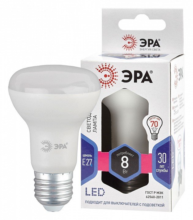 Лампа светодиодная ЭРА E27 8W 6000K матовая LED R63-8W-860-E27 Б0048024
