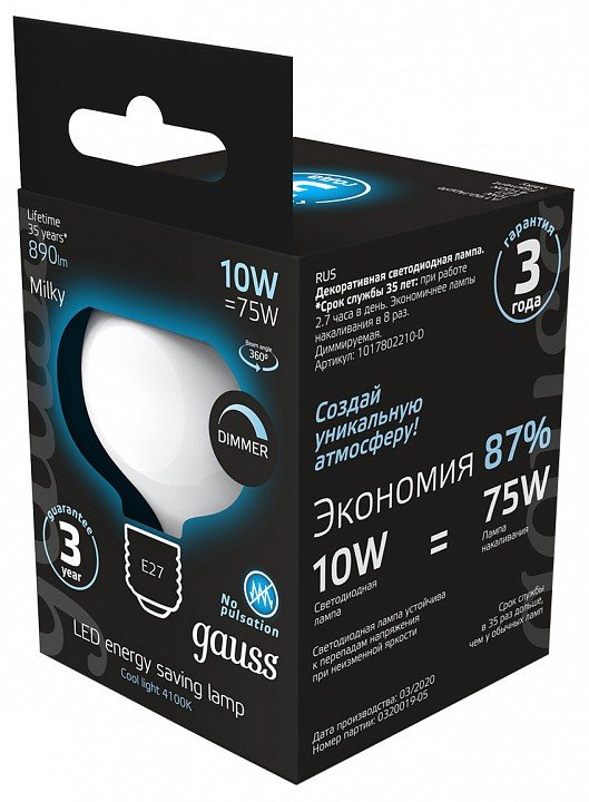 Станьте первым, кто оставит отзыв о товаре Лампа светодиодная филаментная диммируемая Gauss E27 10W 4100К матовая 1017802210-D.