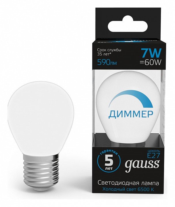 Лампа светодиодная диммируемая Gauss E27 7W 6500K матовая 105102307-D