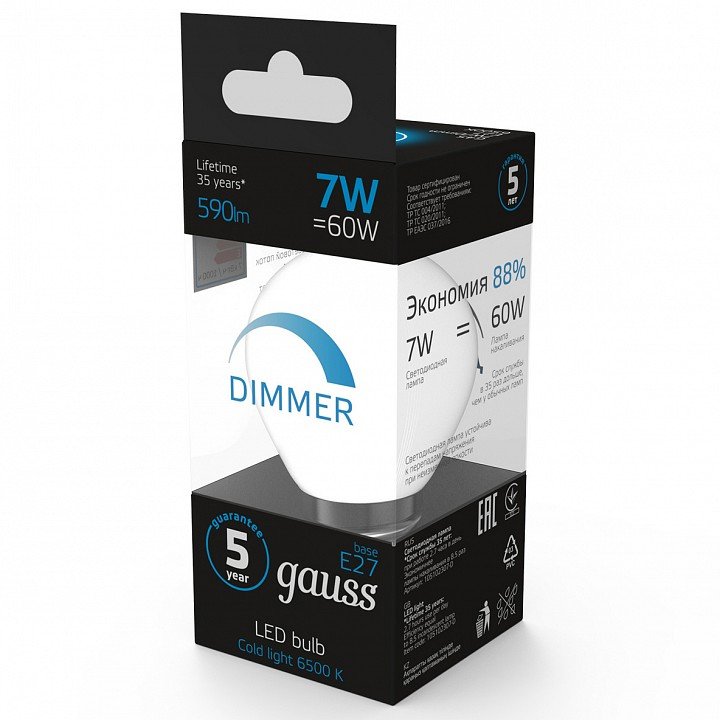 Главная Лампочки Лампа светодиодная диммируемая Gauss E27 7W 6500K матовая 105102307-D