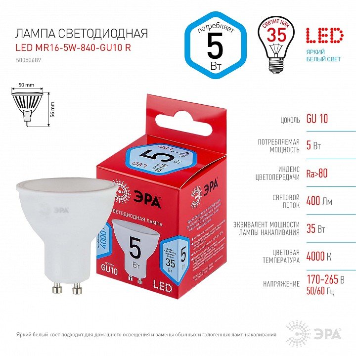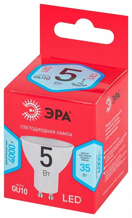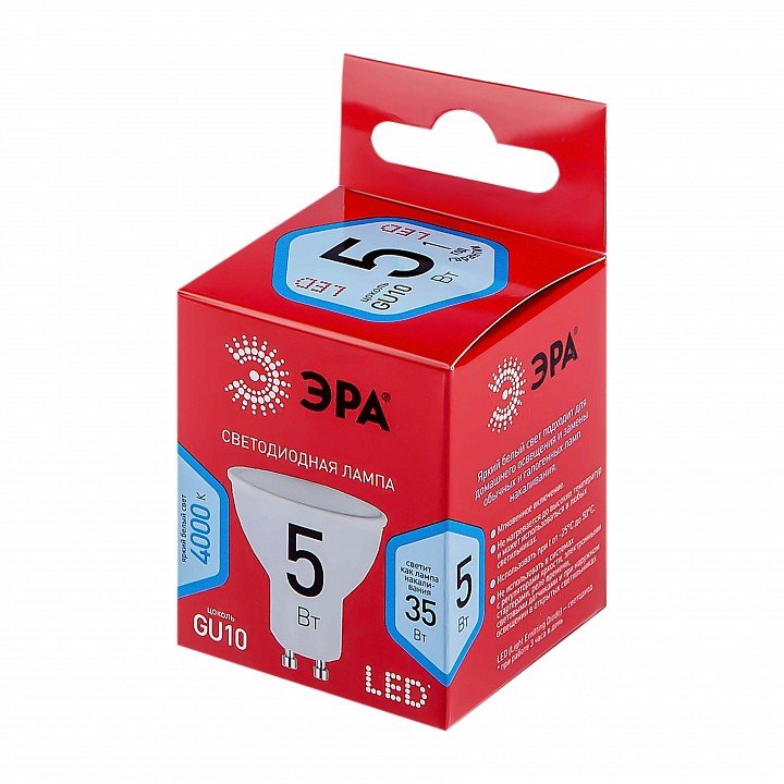 Лампа светодиодная ЭРА GU10 5W 4000K матовая LED MR16-5W-840-GU10 R Б0050689