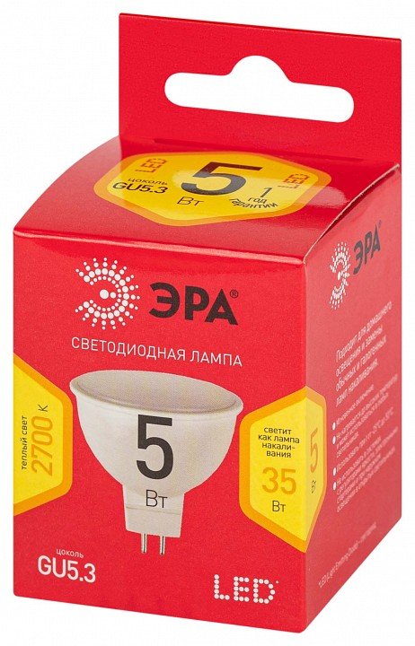 Лампа светодиодная ЭРА GU5.3 5W 2700K матовая LED MR16-5W-827-GU5.3 R Б0050230