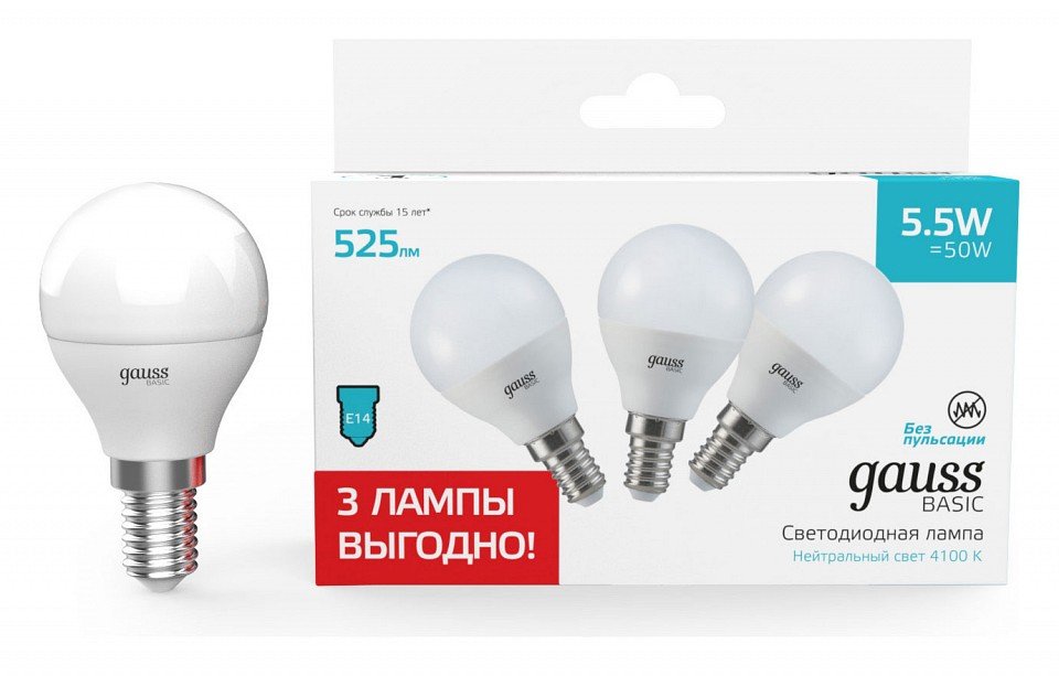 Главная Лампочки Набор ламп светодиодных Gauss Basic E14 5.5Вт 4100K 10531252T