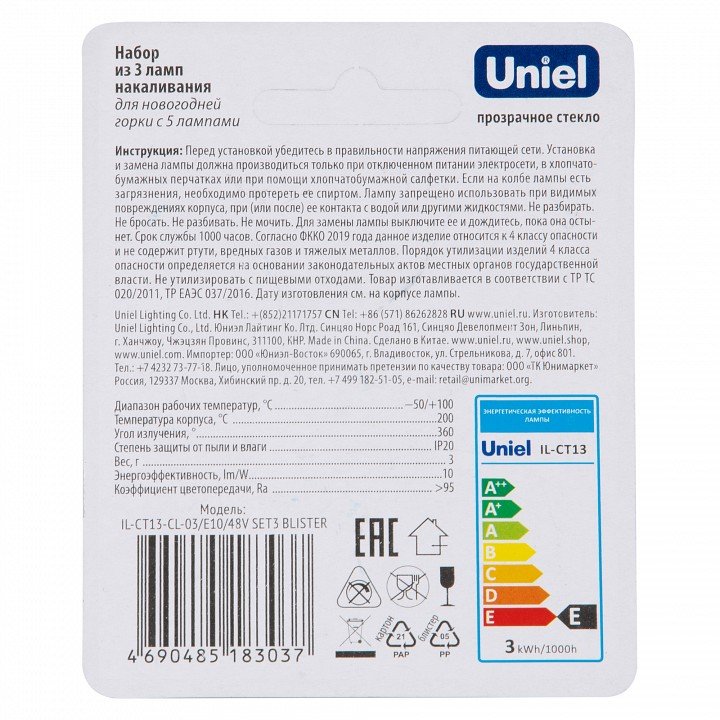 Главная Лампочки Набор из 3 ламп накаливания Uniel IL-CT13 E10 3Вт K UL-00010986