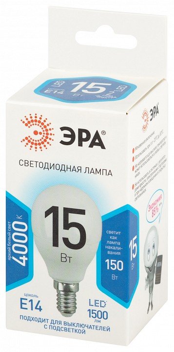 Главная Лампочки Лампа светодиодная Эра Стандарт E14 15Вт 4000K LED P45-15W-840-E14