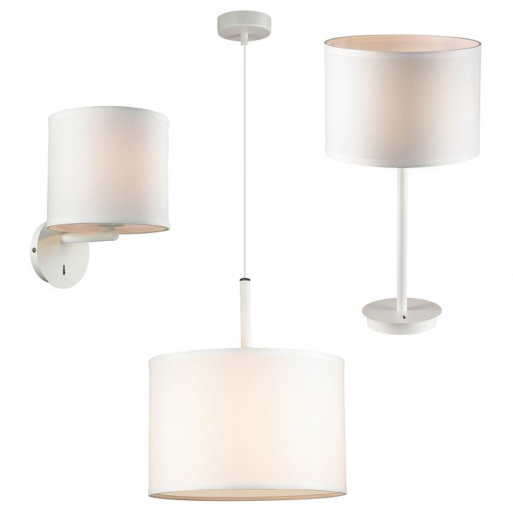 Компоненты, входящие в комплект: Бра 220х185х261 мм. Настольная лампа 280х515 мм. Подвесной светильник 350х400-1800 мм