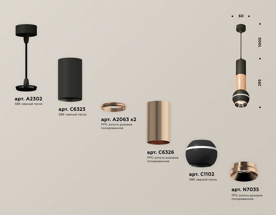 Компоненты, входящие в комплект: крепеж подвесной d60. . корпус d100. . коннектор 2шт. корпус d60 2. насадка передня d70