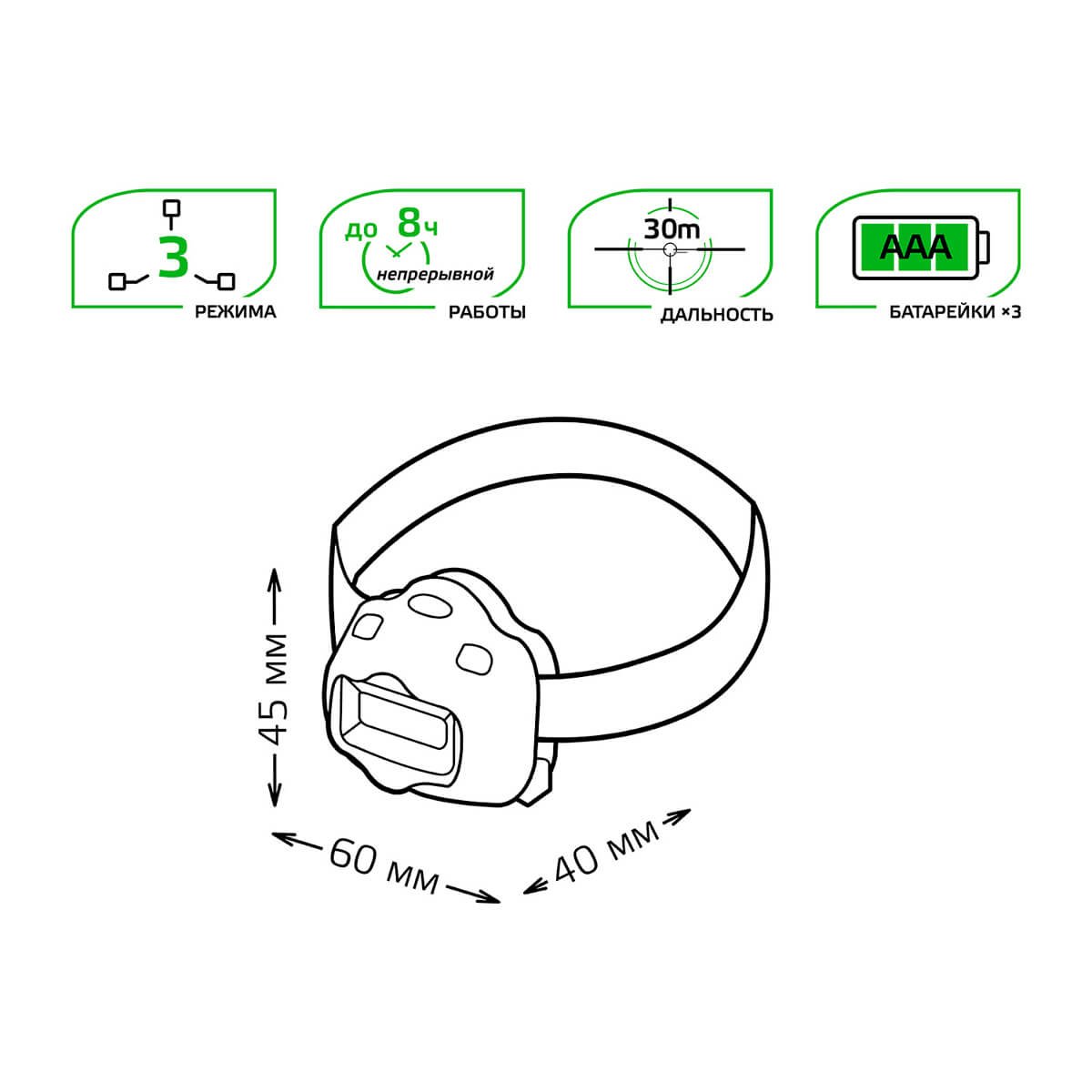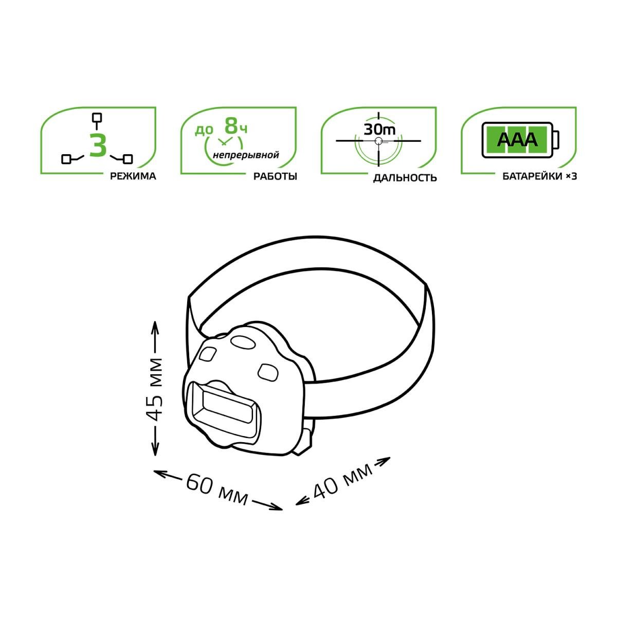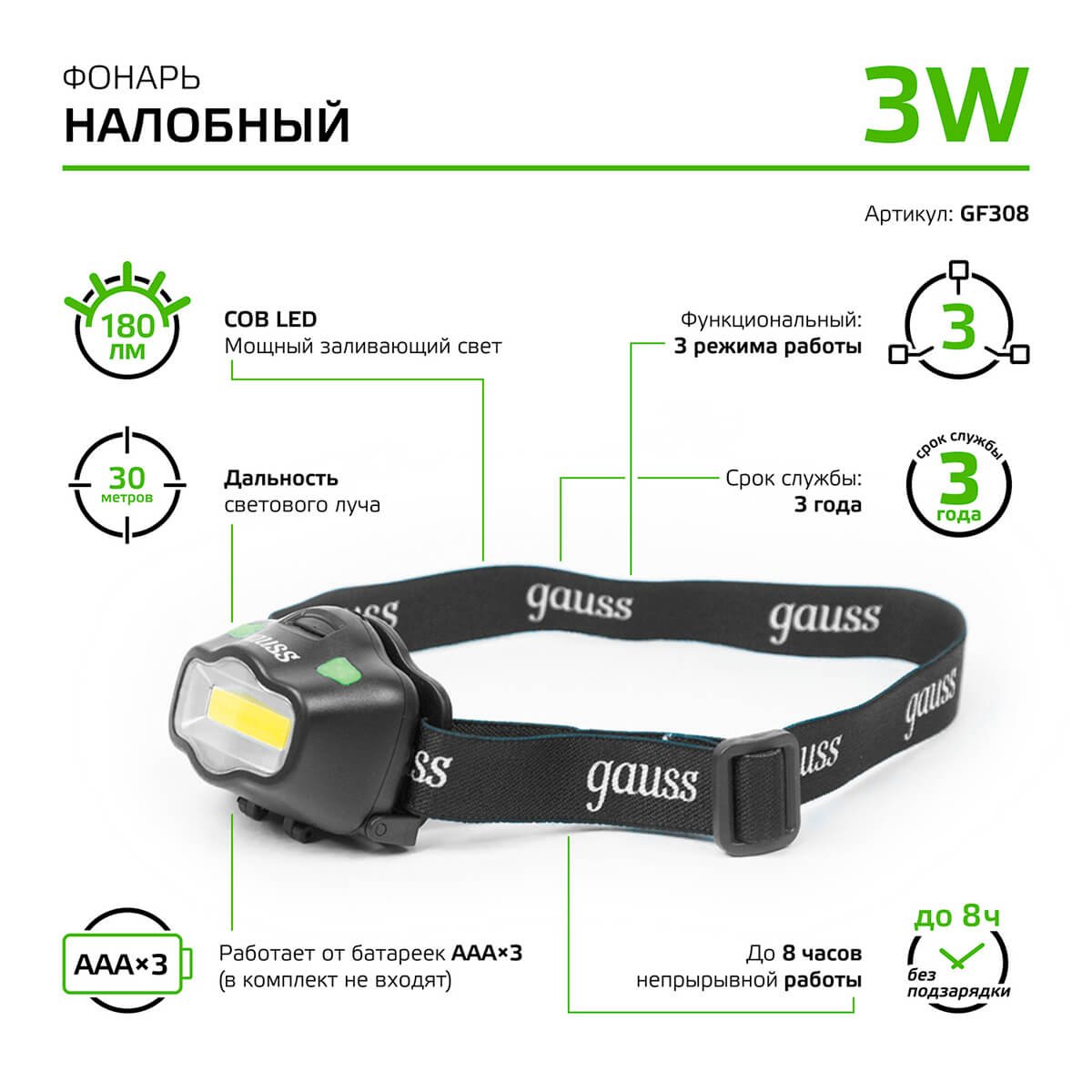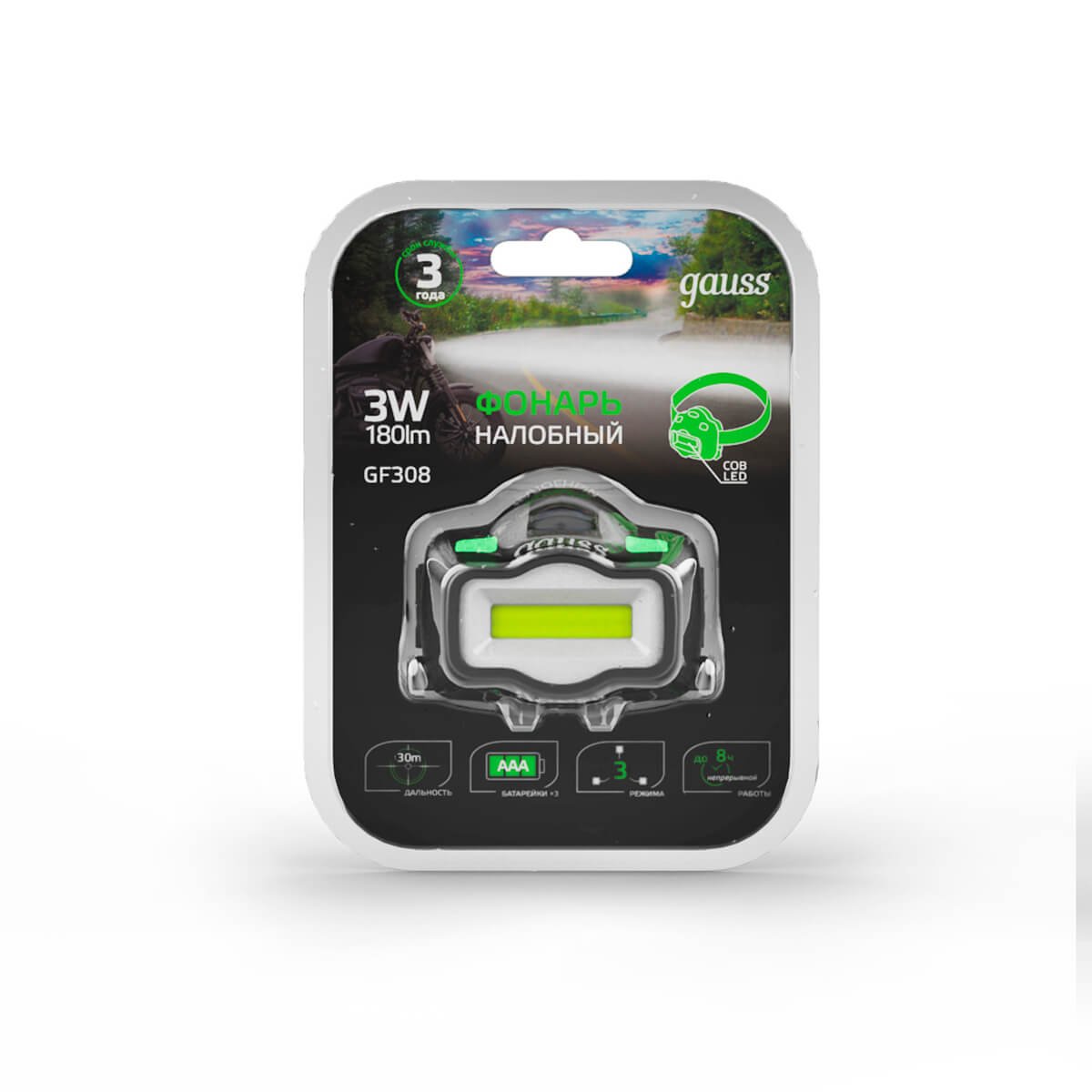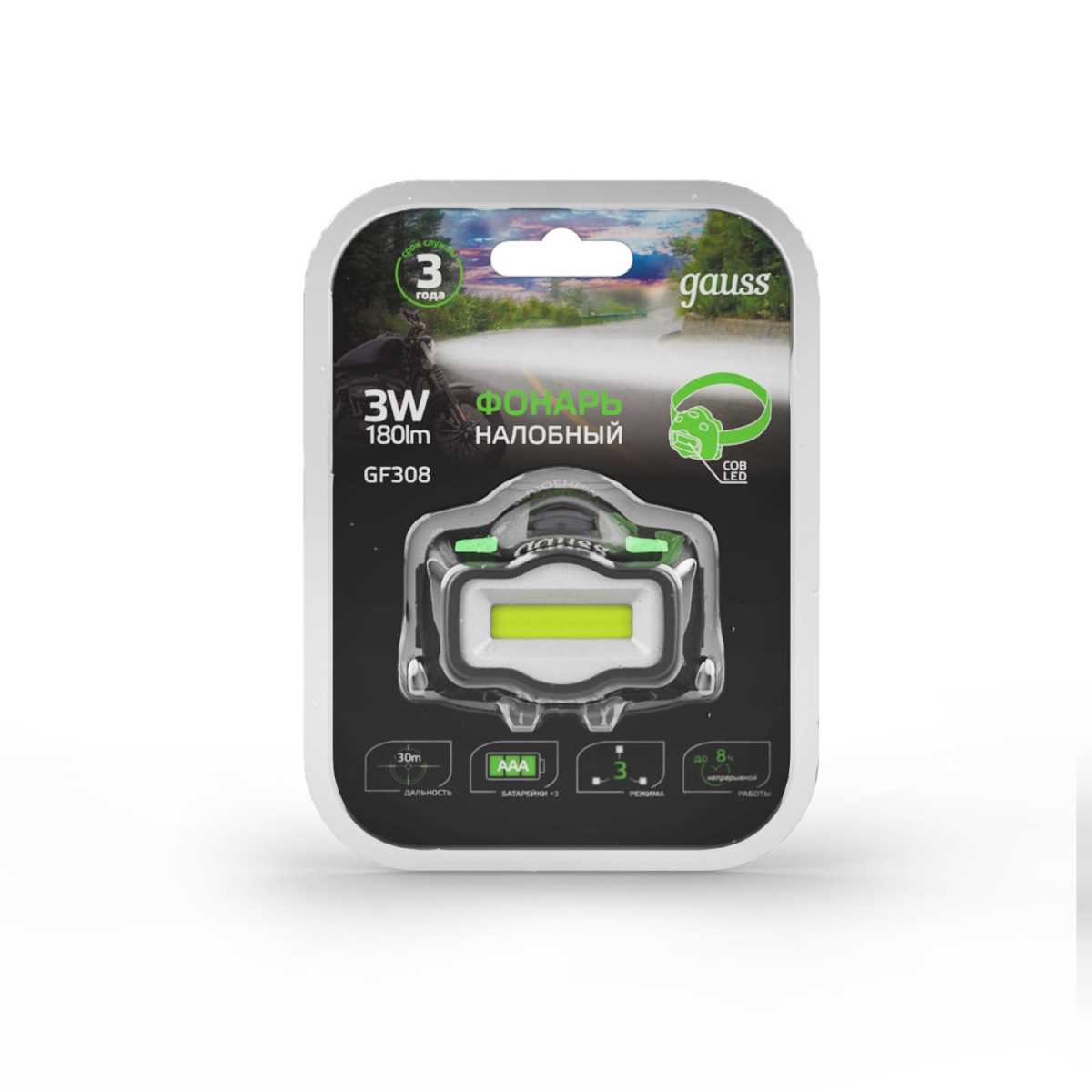 Налобный светодиодный фонарь Gauss от батареек 50х70 180 лм GF308