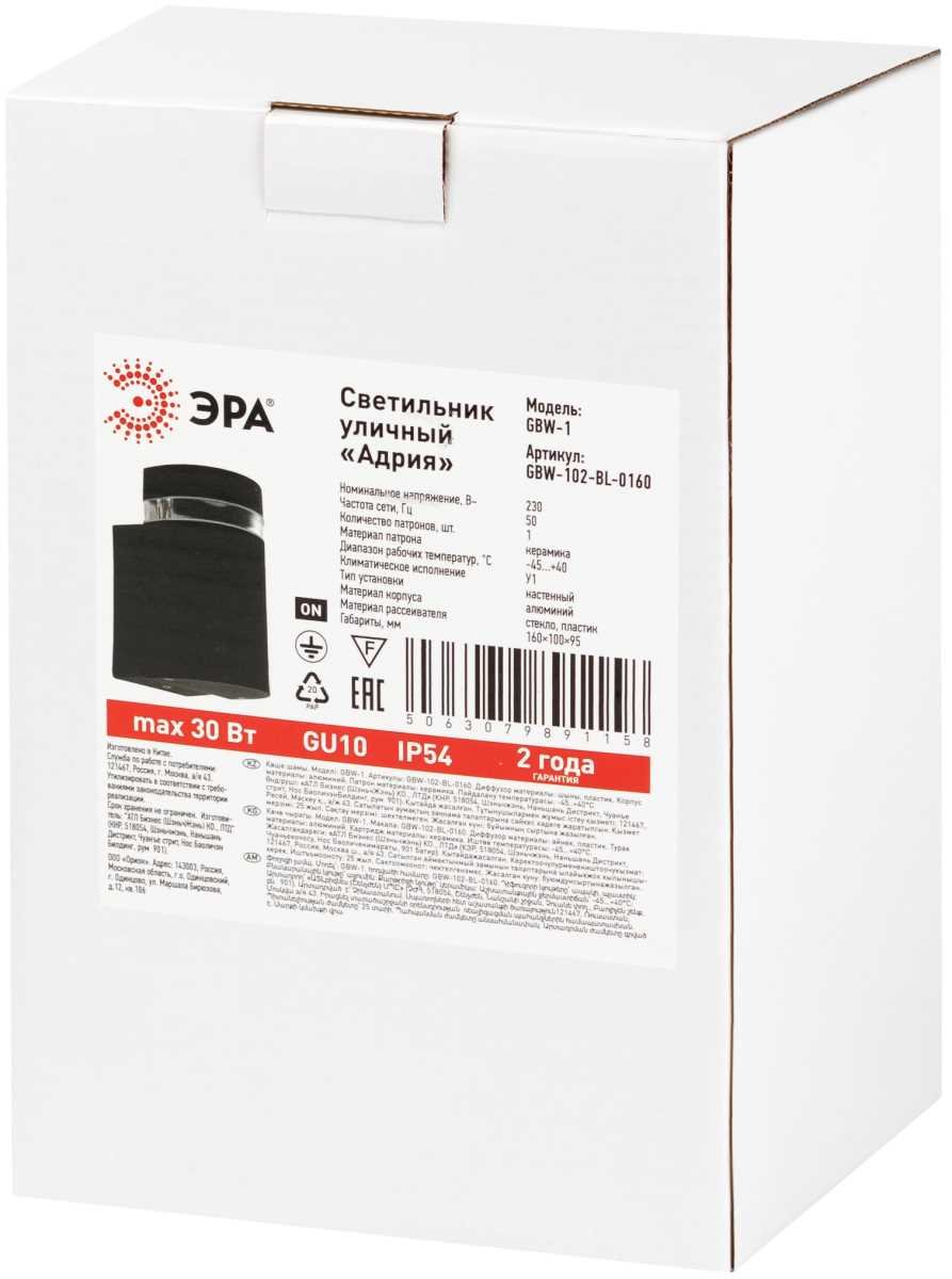 Станьте первым, кто оставит отзыв о товаре Светильник уличный настенный ЭРА «Адрия» GBW-102-BL-0160 230В 1хGU10 IP54 вверх черный Б0069593.