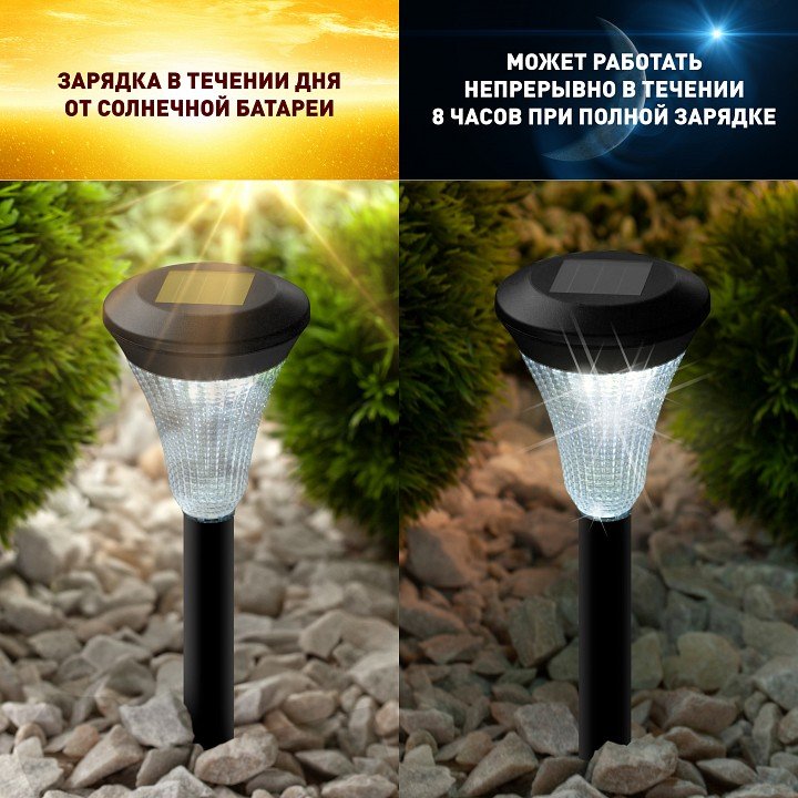 Компоненты, входящие в комплект: светильники - 10 шт.. аккумулятор 1.2 V Li-Ion (время работы без подзарядки 8 часов). солнечная батарея