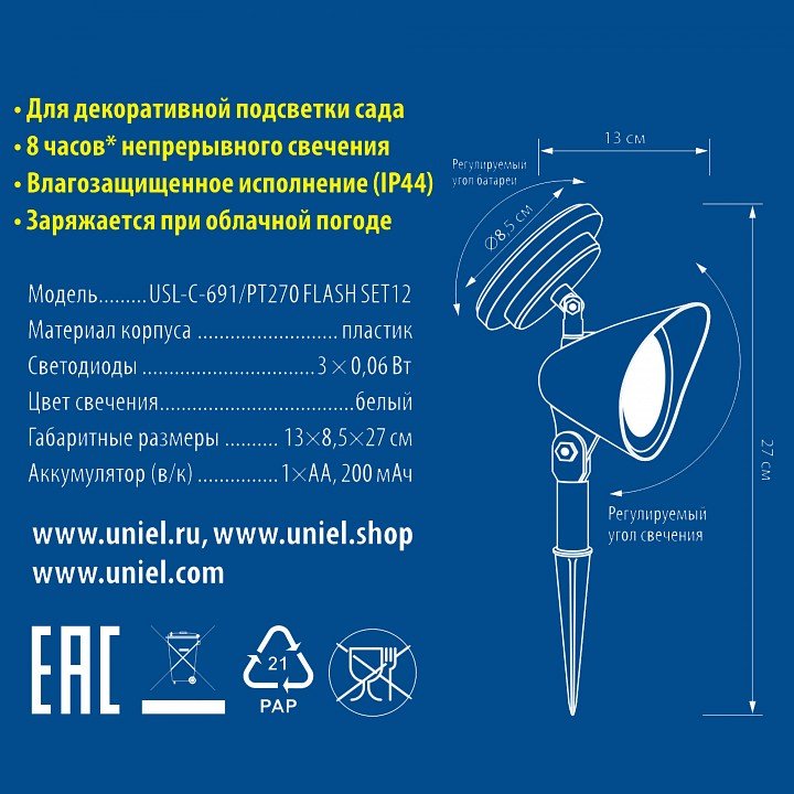 Станьте первым, кто оставит отзыв о товаре Светильник на солнечных батареях (UL-00001688) Uniel Promo USL-C-691/PT270 Flash Set12.